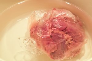 Un altro metodo come consiglia l’USDA è quello di mettere il pollo congelato in ammollo in acqua fredda. Mettetelo in un sacchetto impermeabile e immergetelo in acqua fredda; l’acqua va cambiata ogni 30 minuti. È un metodo che richiede un po’ di pazienza e attenzione perciò se avete molta fretta potete utilizzare l’apposita funzione del microonde. Dovrete però poi cucinare la carne velocemente.