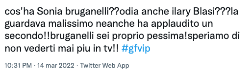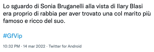 Tanti utenti si sono così domandati su Twitter se tra loro ci fosse qualche trascorso: “Cos’ha Sonia Bruganelli? Odia anche Ilary Blasi? La guardava malissimo, neanche ha applaudito un secondo”, “Lo sguardo di Sonia Bruganelli alla vista di Ilary Blasi era proprio di rabbia per aver trovato una col marito più famoso e ricco del suo”, e ancora “Non l’ha neanche salutata, l’ha guardata come se fosse uno scarafaggio dall’alto della sua arroganza”.