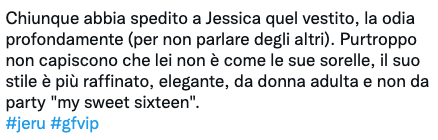 “Chiunque abbia spedito a Jessica quel vestito la odia profondamente. Purtroppo non capiscono che lei non è come le sue sorelle, il suo stile è più raffinato, elegante, da donna adulta e non da party” ha commentato qualcuno sui social.