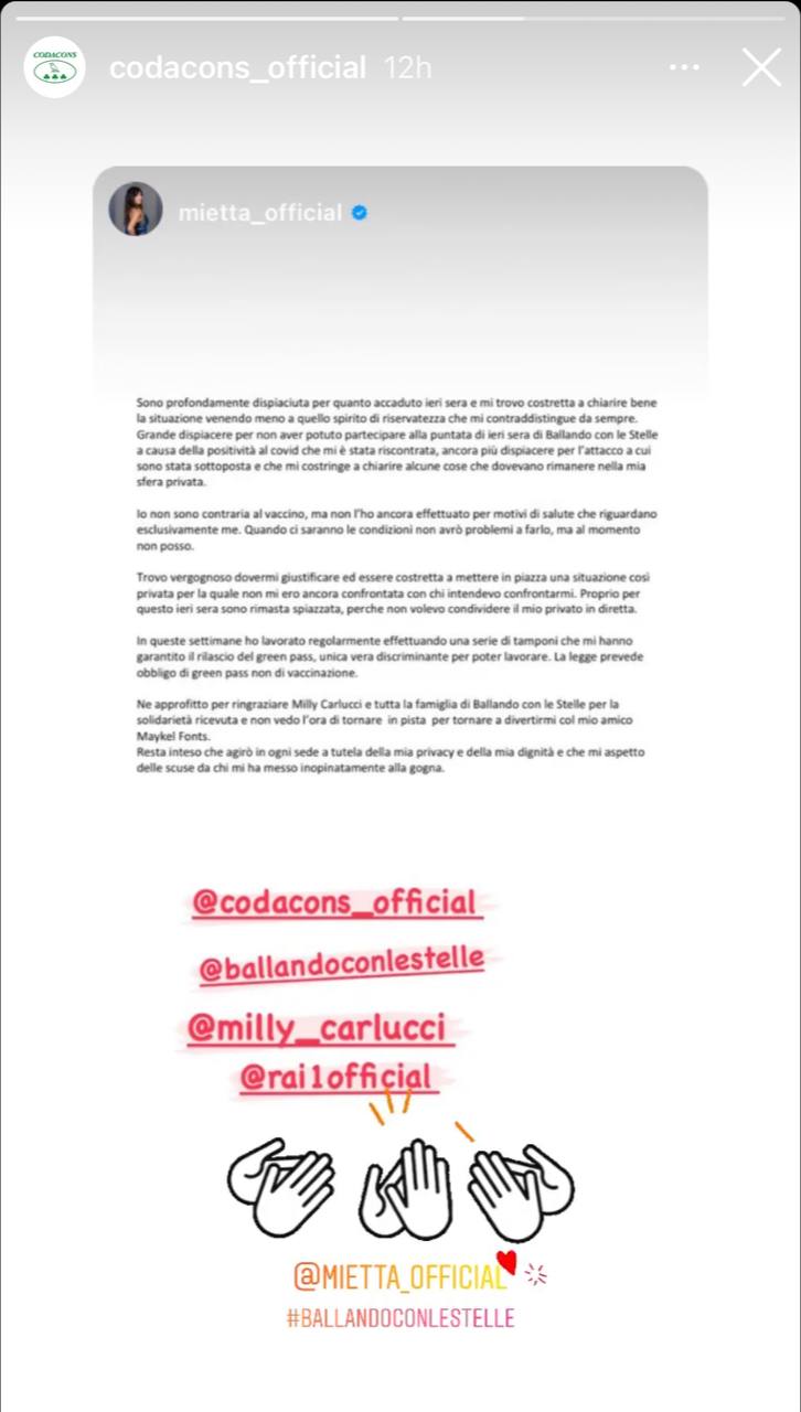 “Sono profondamente dispiaciuta […] io non sono contraria al vaccino ma non l’ho ancora effettuato per motivi di salute […] trovo vergognoso dovermi giustificare […] Agirò in ogni sede a tutela della mia privacy e della mia dignità, mi aspetto delle scuse da chi mi ha messo inopinatamente alla gogna” ha scritto Mietta su Instagram.