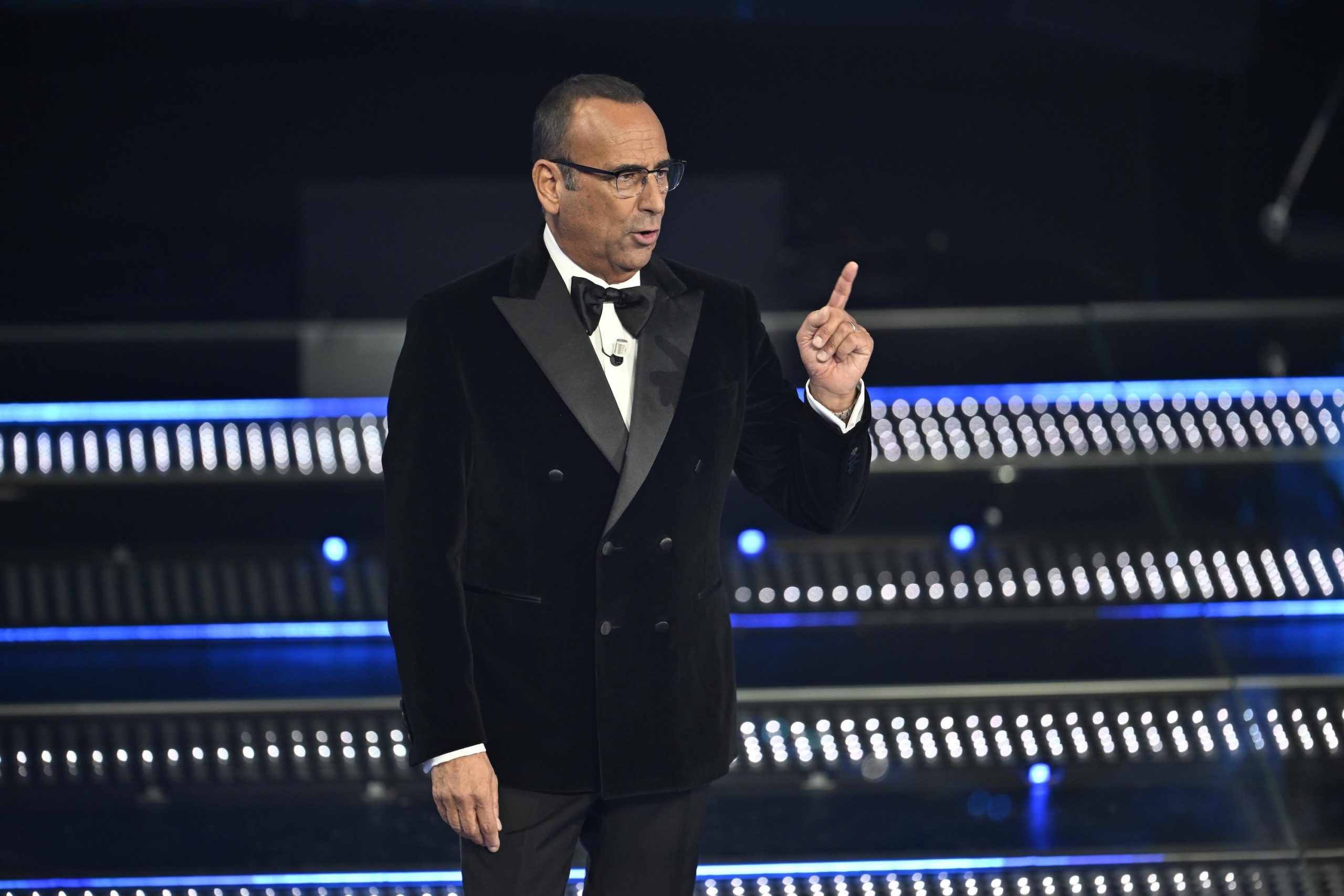Carlo Conti in una pausa pubblicitaria a Sanremo 2025: ‘troppi omaggi nelle prime file’. Come si comporta con il pubblico