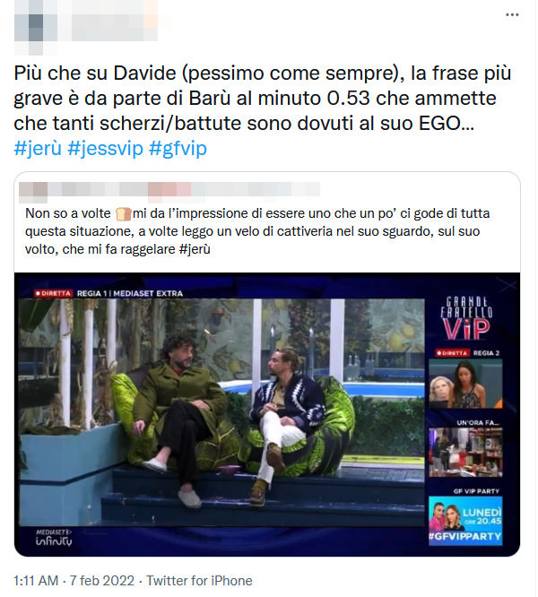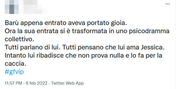 Al GF Vip fanno discutere delle affermazioni su Jessica da parte di Barù: il concorrente parla di ‘battute di caccia’ e fa indignare i fan