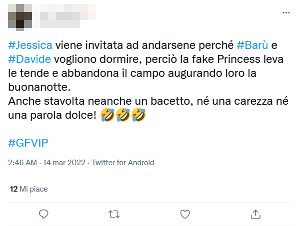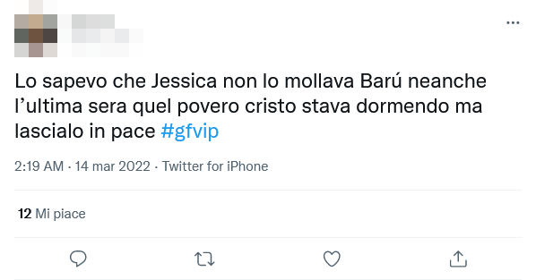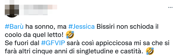 Andiamo con ordine. Quando è scesa l’ultima notte su questa edizione del GF Vip, Jessica Selassié non ha mollato quello che sembra essere stato il suo obiettivo per tutto il reality show: la 27-enne è rimasta infatti appiccicata a Barù, seguendolo in stanza mentre lui voleva soltanto dormire.