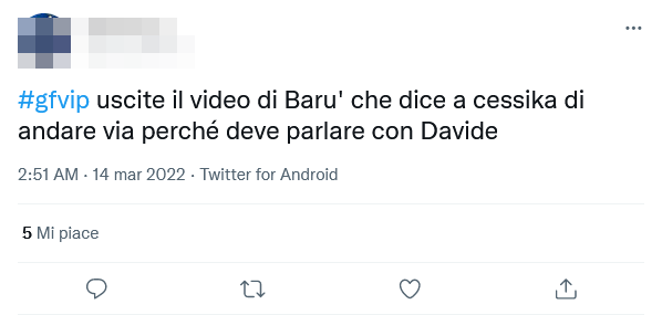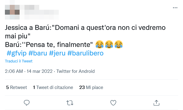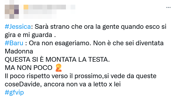 Il discorso, tra uno sbadiglio di Barù e l’altro, è andato avanti in maniera un po’ delirante. Jessica gli ha fatto notare: “Sarà strano che ora la gente quando esco si gira e mi guarda“.