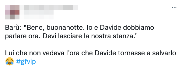 Nel frattempo però, Jessica continuava a trattenersi senza andar via dalla stanza, forse sperando in un moto di nostalgia da parte di Barù in questa sua ultima sera. La sua presenza sul letto, inoltre, impediva a Davide di andare a dormire… Quando però Silvestri è entrato in camera, Barù l’ha presa come un’occasione per mandare via la Selassié, liquindandola con un “Bene, buonanotte. Io e Davide dobbiamo parlare ora. Devi lasciare la nostra stanza“.