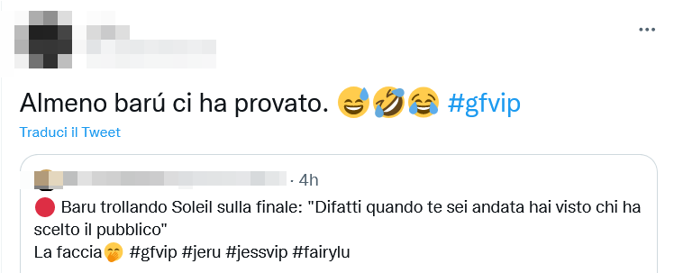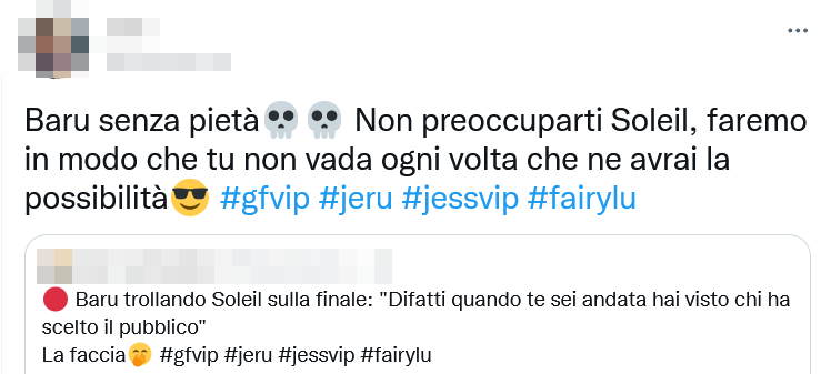 In molti hanno infatti fatto notare che con quelle sue parole Barù si riferisse a Delia Duran, prima finalista del GF Vip, ma anche all’altra persona già in finale, Lulù Selassié. Due persone con le quali la Sorge non ha rapporti proprio eccezionali. Ma davvero è giusto ritenere che Barù sia stato spietato con Soleil? O si tratta di una esagerazione per nulla rispondente alla realtà?