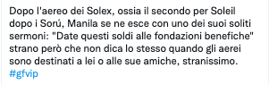Si tratta di un aereo che è passato sopra la casa del GF Vip, dedicato a Soleil e – inaspettatamente – a Barù: “Sole e Barù, la verità sempre. #Sorù”. I due infatti appaiono complici e amici all’interno della casa.