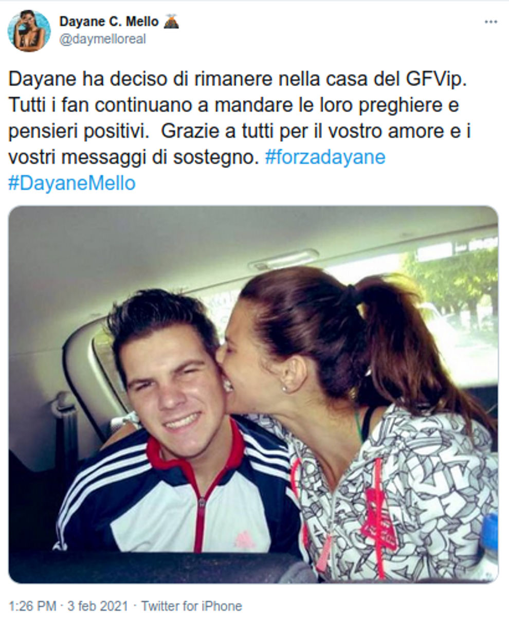 Nel frattempo, però, in tanti stanno facendo sentire il proprio affetto per la concorrente del GF Vip con l’hashtag #forzadayane, tanto che sul suo account ufficiale è apparso il seguente messaggio: “Dayane ha deciso di rimanere nella casa del GFVip. Tutti i fan continuano a mandare le loro preghiere e pensieri positivi. Grazie a tutti per il vostro amore e i vostri messaggi di sostegno”.
