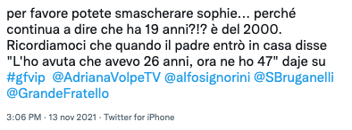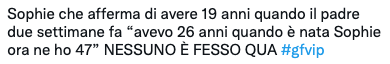 I fan più attenti hanno ricordato le parole del papà di Sophie, che quando è entrato nella Casa per salutarla ha spiegato di averla avuta “quando avevo 26 anni, ora ne ho 47”.
