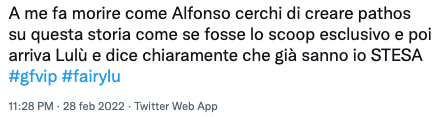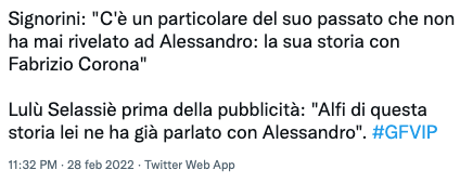 Lulù infatti, alla notizia lanciata da Alfonso Signorini ha subito risposto: “Alfi, di questa storia lei ne ha già parlato con Alessandro”, spegnendo di fatto la fiamma del gossip che forse Alfonso invece voleva alimentare.
