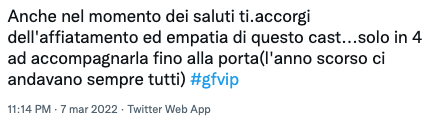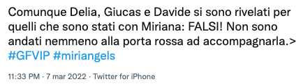 “Dopo 6 mesi potevano accompagnarla tutti alla porta rossa, vergognosi a dir poco”, “Dei gran cafoni a non andare alla porta”, “Delia, Giucas e Davide si sono rivelati per quelli che sono stati con Miriana: falsi! Nono sono nemmeno andati alla porta rossa ad accompagnarla!”, “Anche nel momento dei saluti ti accorgi dell’affiatamento ed empatia di questo cast…” hanno tuonato alcuni utenti infastiditi su Twitter.