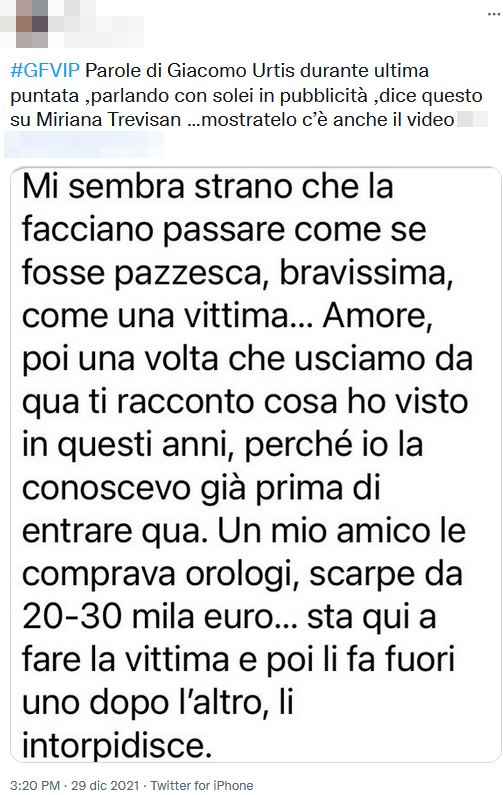 Tempo fa, infatti, Giacomo aveva parlato molto male di Miriana. Il chirurgo aveva dichiarato di conoscerla da prima del reality e che, nel corso degli anni, avrebbe conosciuto uomini che le facevano costosissimi regali. E, per questi motivi, ha esplicitato di non sopportare l’atteggiamento “da vittima” della stessa Trevisan.