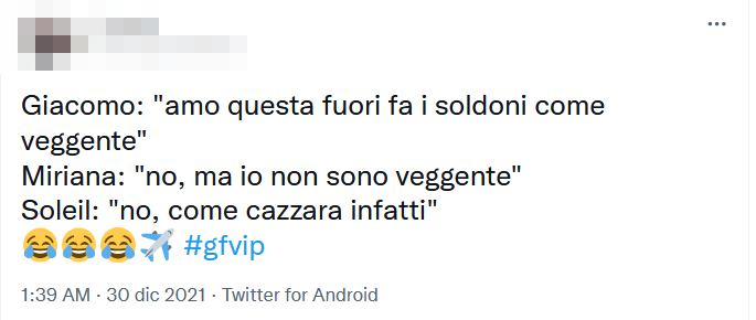 “No, ma io non sono veggente”, gli ha subito risposto la Trevisan. E Soleil, cogliendo l’attimo, ha risposto: “no, ma come ca..ara infatti”.