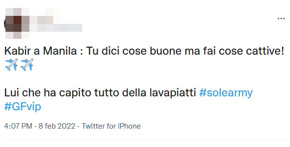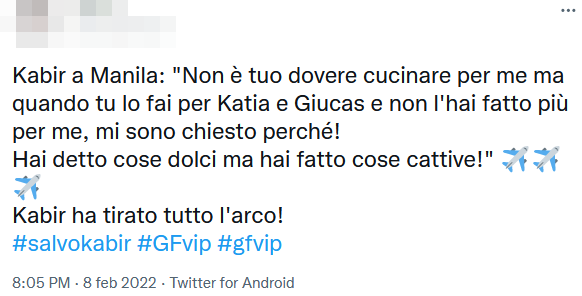 “Non è tuo dovere cucinare per me – ha esordito Kabir – ma quando tu lo fai per Katia e Giucas e non l’hai fatto più per me, mi sono chiesto perché! È stata una sorpresa per me. Hai detto cose dolci ma hai fatto cose cattive“.