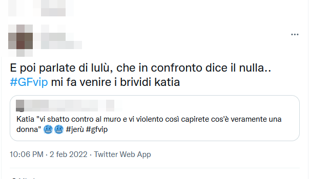 LEGGI ANCHE :– GF Vip, Katia offesa da Manila tira una frecciata velenosissima alla sua ex amica: ‘cosa altro ha da dare?’