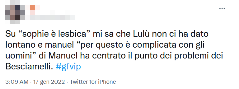 Andiamo con ordine. Mentre Manuel Bortuzzo giocava insieme a Lulù e Giucas con alcuni pupazzi, gli è sfuggito un commento un po’ velenoso su Sophie Codegoni. Manovrando i pupazzi, a Manuel è sfuggita la parola ‘lesbiche’. Giucas Casella, dunque, ha chiesto “chi è lesbica?” e Lulù ha risposto “Sophie!”