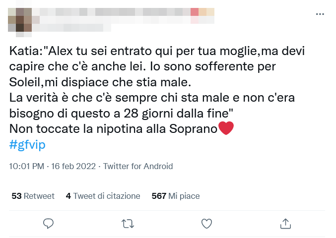 “Alex – gli ha detto – tu sei entrato qui per tua moglie,ma devi capire che c’è anche lei. Io sono sofferente per Soleil, mi dispiace che stia male. La verità è che c’è sempre chi sta male e non c’era bisogno di questo a 28 giorni dalla fine“.
