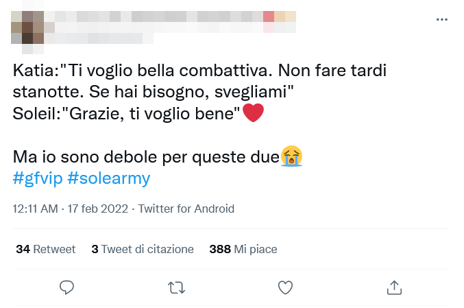 Ma, oltre al discorso rivolto ad Alex, Katia si è anche alzata dal suo posto per stare vicino alla Sorge, abbracciandola e cercando di tenerla su di morale. “Ti voglio bella combattiva. Non fare tardi stanotte. Se hai bisogno, svegliami“, le ha detto prima di andare a dormire, mettendosi a sua completa disposizione e dimostrandole un affetto immenso.