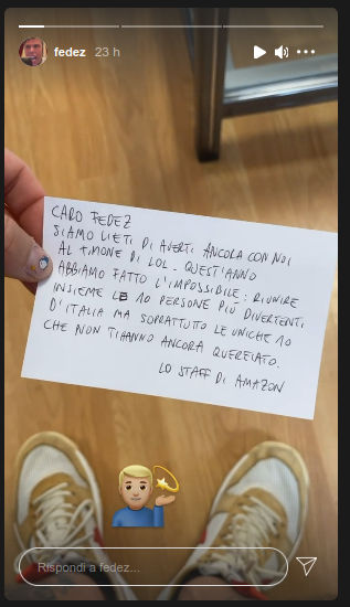 Nella messaggio, firmato dallo staff di Amazon, è scritto: “Caro Fedez, siamo lieti di averti ancora con noi al timone di LOL. Quest’anno abbiamo fatto l’impossibile: riunire insieme le 10 persone più divertenti d’Italia ma soprattutto le uniche che non ti hanno ancora querelato”.