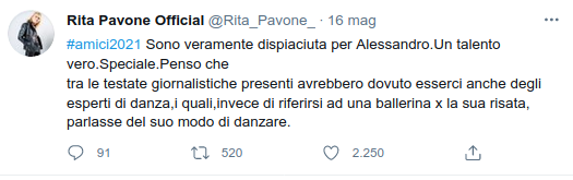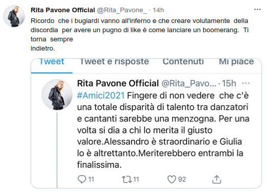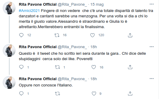 Andiamo con ordine. Durante la finale di Amici 20, Rita Pavone ha notato che, a suo parere, i ballerini fossero più bravi dei cantanti in gara. E proprio a riguardo ha twittato: “Fingere di non vedere che c’è una totale disparità di talento tra danzatori e cantanti sarebbe una menzogna. Per una volta si dia a chi lo merita il giusto valore. Alessandro è straordinario e Giulia lo è altrettanto. Meriterebbero entrambi la finalissima”.