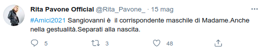 Lei, in tutta risposta, prima ha fatto i complimenti a Sangiovanni, dicendo che “è il corrispondente maschile di Madame. Anche nella gestualità. Separati alla nascita”.