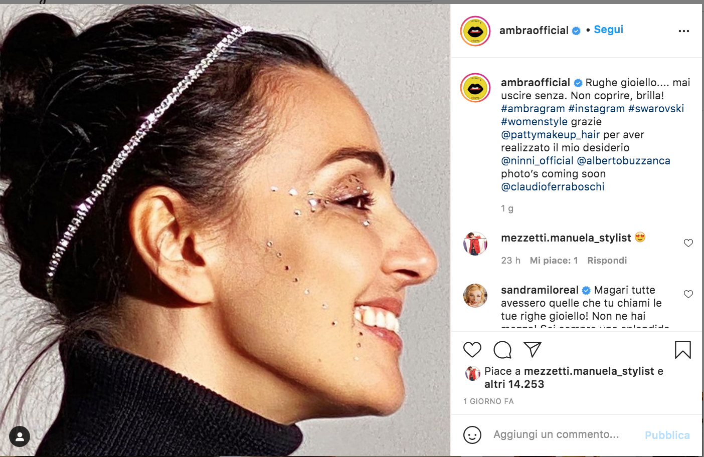 Tra i post più recenti troviamo un suo primo piano di profilo mentre sorride con dei brillantini sul volto e la didascalia che recita: “Rughe gioiello…. mai uscire senza. Non coprire, brilla!”
