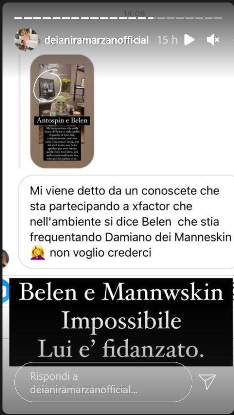A parlarne è stata anche l’influencer Deianira Marzano attraverso delle stories su Instagram. Deianira ha spiegato di aver ricevuto messaggi a riguardo: c’è chi dice che Belen in passato abbia spesso lasciato apprezzamenti sotto le foto del cantante su Instagram e ancora chi dice nell’ambiente di X Factor se ne sta parlando.