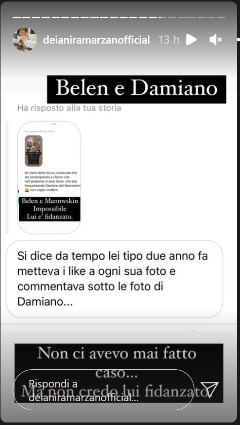 Deianira ha scritto su Instagram che il flirt sembrerebbe abbastanza impossibile, soprattutto perché Damiano è felicemente fidanzato. Anche Belen sarebbe sentimentalmente impegnata, nonostante le voci di una crisi con Antonino Spinalbese si fanno sempre più insistenti.