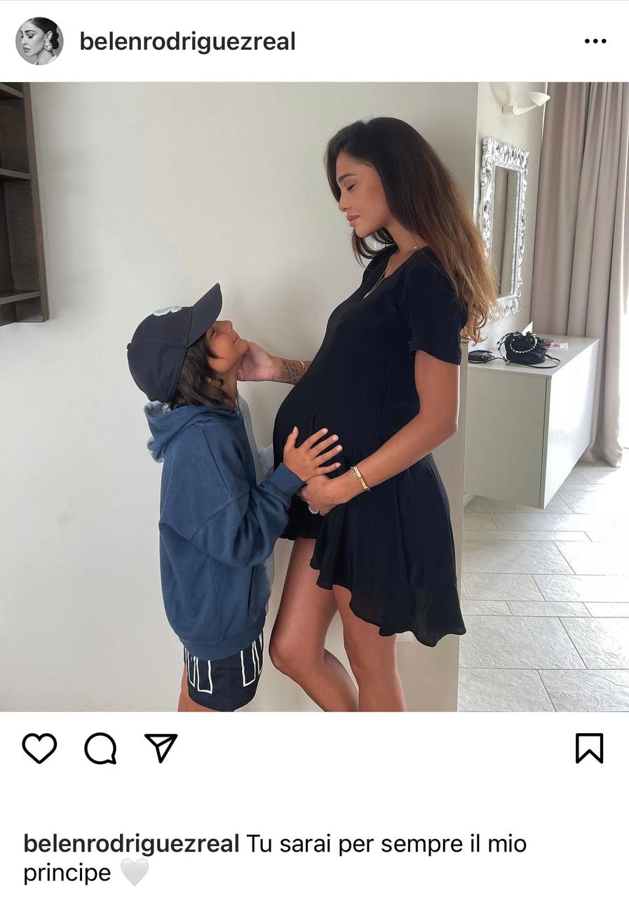 Nella foto pubblicata dalla Rodriguez si vede Santiago, ormai grande, accarezzare il pancione della mamma. “Tu sarai sempre il mio principe” ha scritto Belen rivolgendosi a suo figlio.