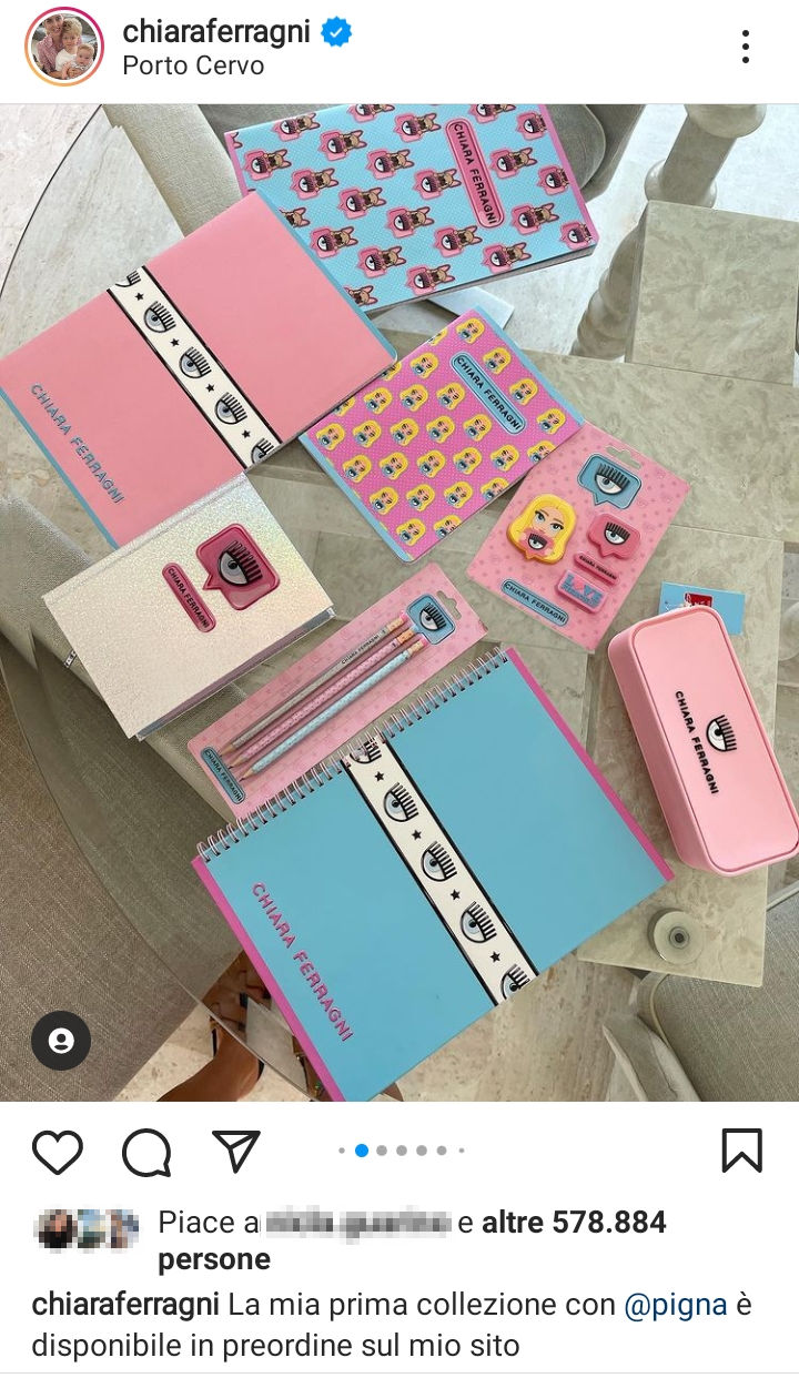 “La mia prima collezione con Pigna è disponibile in preordine sul mio sito ChiaraFerragniBrand – ha scritto la bella influencer – già da oggi e dal 23 agosto nei migliori negozi di cartoleria in Italia. Spero vi piaccia, io ne sono innamorata. Vi faccio vedere di più nelle stories”.