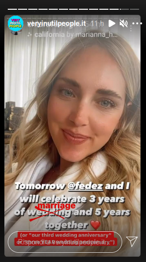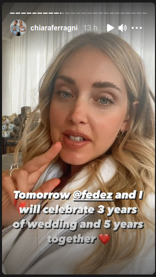 L’errore dov’è? Ma nella scritta che Chiara ha sovrimposto nelle sue storie! La Ferragni ha infatti scritto, in inglese: “Tomorrow Fedez and I will celebrate 3 years of wedding and 5 years together” (domani Fedez e io celebreremo 3 anni di matrimonio e 5 anni insieme, ndr).