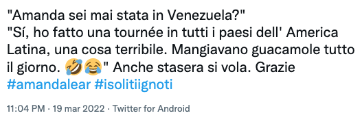 Alla domanda se fosse mai stata in Venezuela, Amanda Lear ha risposto: “Sì, ho fatto una tournée in tutti i paesi dell’America Latina, una cosa terribile. mangiavano guacamole tutto il giorno” senza tenere conto che proprio di fronte a lei ci fosse un venezuelano.