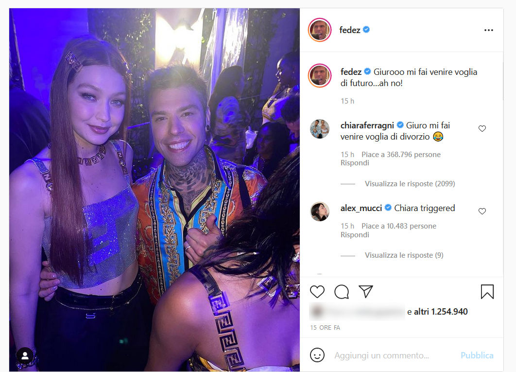Andiamo con ordine. Da Versace, Fedez ha fatto una foto con Gigi Hadid, l’ennesima della sua vita. Poi, l’ha postata su Instagram con tanto di commento: “Giurooo mi fai venire voglia di futuro… ah no!”.
