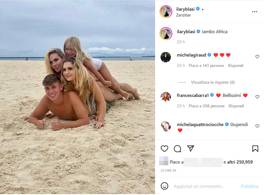 Partiamo dal principio. Ilary Blasi ha pubblicato sui social una foto insieme ai figli Cristian, Chanel e Isabel sulle spiagge di Zanzibar, in un vortice di capelli biondi… Fin qui niente di male, se non fosse che il momento delicato della sua vita (e la separazione da Francesco Totti) stanno facendo in modo che molti suoi follower esagerino un po’ con i commenti.