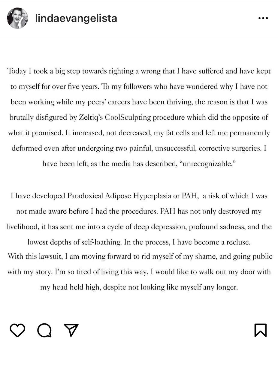 Linda Evangelista ha scritto un lungo post su Instagram per spiegare la sua drammatica situazione