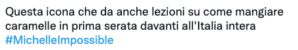 Tra questi, c’è stata anche Maria De Filippi, che come ha ben spiegato un utente su Twitter, è riuscita a “Dare lezioni su come mangiare caramelle in prima serata davanti all’Italia intera”. Quello della caramella infatti è un gesto praticamente distintivo della conduttrice italiana, che – cascasse il mondo – lei compie in ogni suo programma.