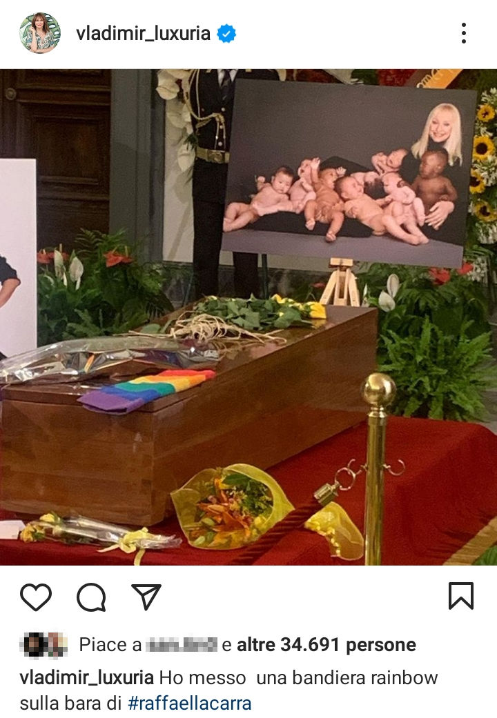 Su Instagram, Vladimir Luxuria ha mostrato una foto della camera ardente, scrivendo: “Ho messo una bandiera rainbow sulla bara di Raffaella Carrà”.