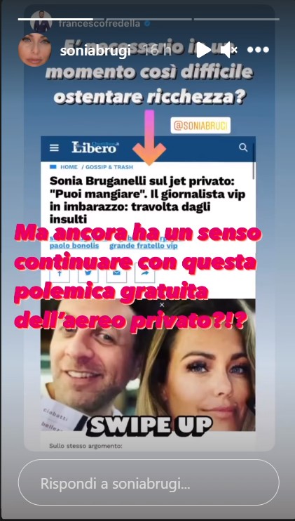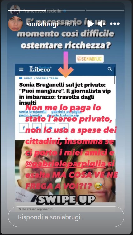 Sonia ha risposto alle accuse: “Non me lo paga lo Stato l’aereo privato, non lo uso a spese dei cittadini, ci porto i miei amici […] Ma cosa ve ne frega a voi?”