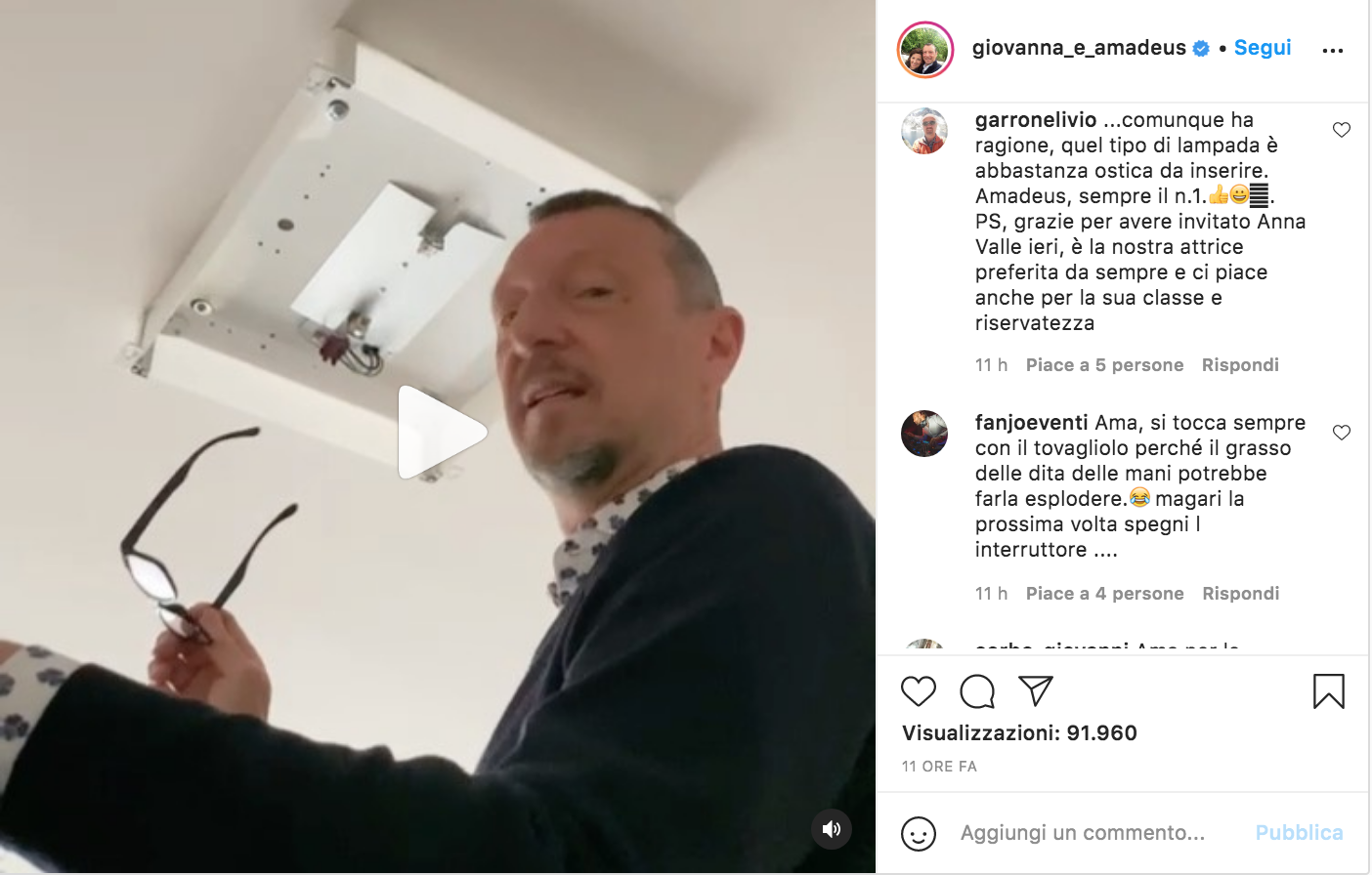 Per fortuna, tutto è bene ciò che finisce bene: Amadeus è stato protagonista di un video casalingo realizzato dalla moglie Giovanna in cui è alle prese con il cambio di una lampadina, ma non sono mancate critiche e avvertimenti.